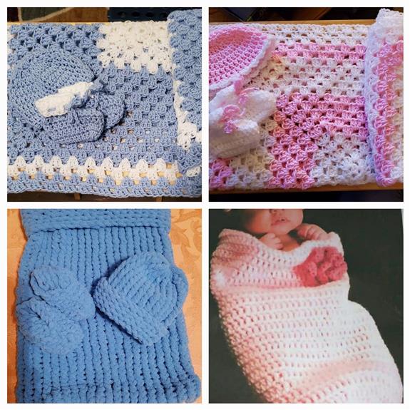 * Baby hat and booties, baby blanket, baby swaddle (cocoon).